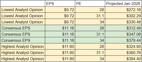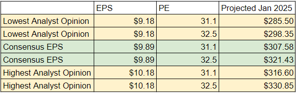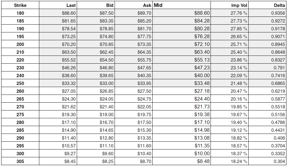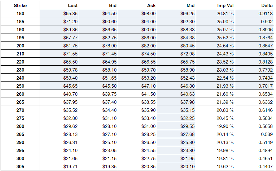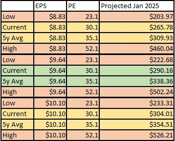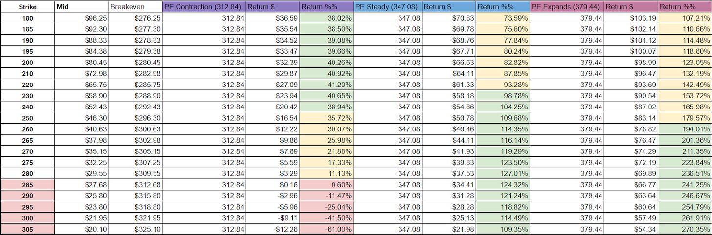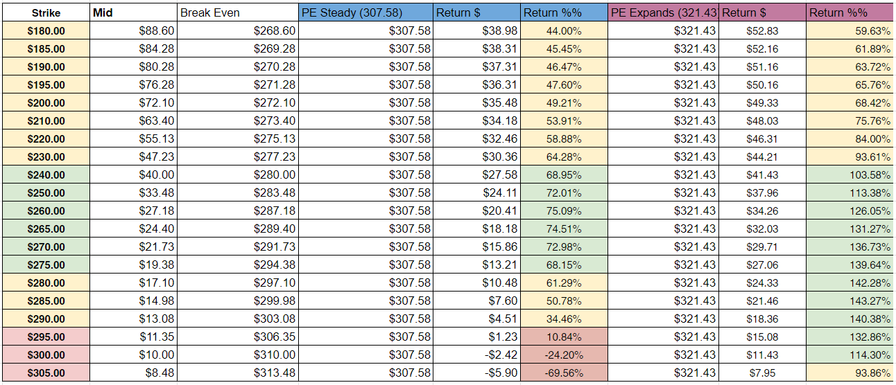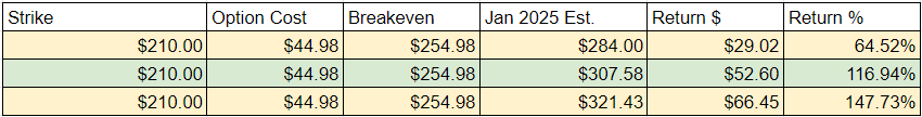Our friend on the scoreboard is the $210 Strike. So what if we check those against our updated projection of $307-$321? How does the $284 look, Who cares! I will go with my numbers for this one because if I evaluate three prices the chart gets huge. You can see that in a later chart. The thing you need to know is that at $284 most of the 2025 options return 10-17%, not much different than buying the underlying stock with plenty more risk.